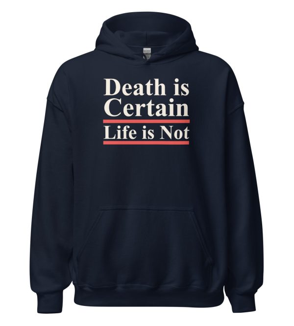 Invite your friends to delve into the enigma and see if they can identify the sources that inspired this design. The Death is Certain Life is Not Hoodie is the perfect choice for sparking conversation while offering unmatched comfort and style.