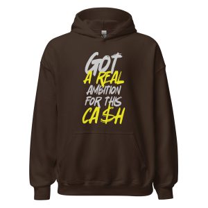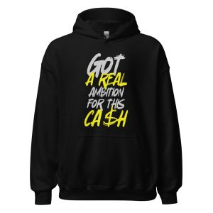 Embodying the drive and hustle of the urban spirit, our hoodie features the bold phrase “Got a Real Ambition for this Cash.” This striking design captures the essence of determination and aspiration, making it a perfect addition to your wardrobe. Crafted with care and attention to detail, this hoodie is 100% original and designed by our talented team. The quality fabric ensures comfort while you pursue your goals, whether in the streets or at home.